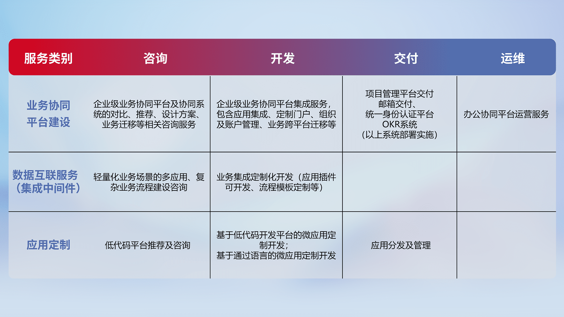 针对钉钉、、、、企微、、、、IDaas等平台级产品提供产品的规划、、方案、、交付、、、定制化开发等服务,,,,实现如统一协同办公、、智能客户服务、、混合会议管理、、、、智能数据查询、、、等业务场景,,,实现数字化转型。。。。